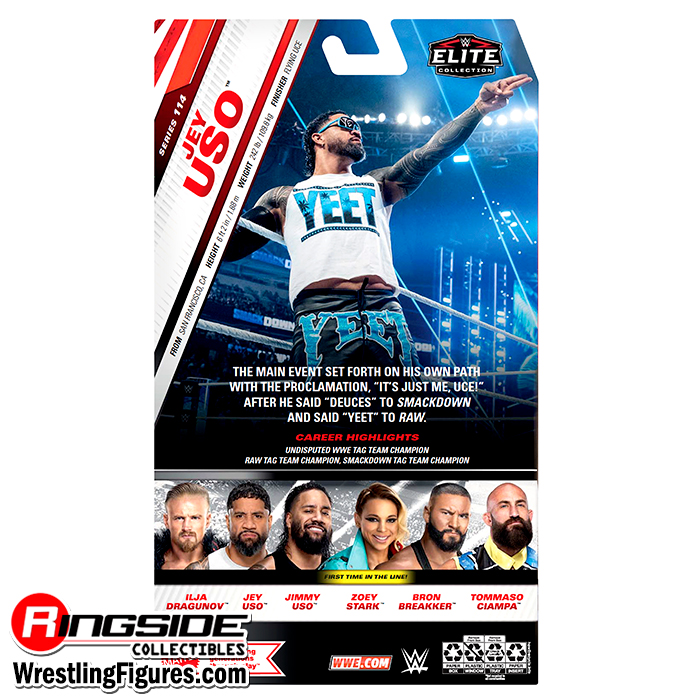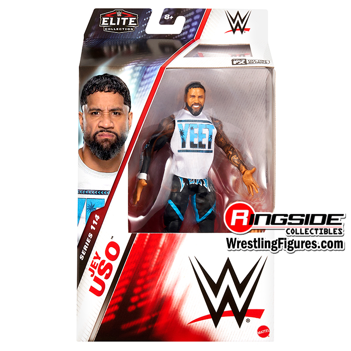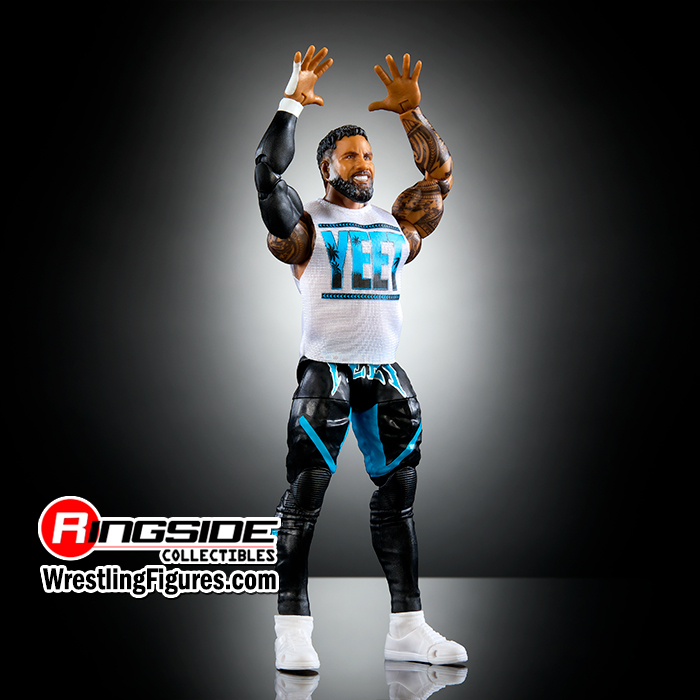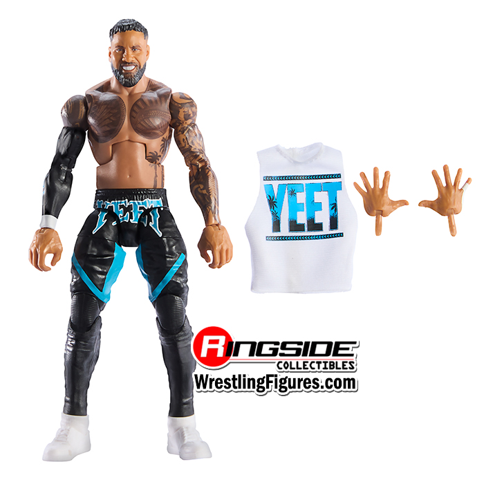 Eat, sleep, yeet, repeat: Jey Uso’s ready to forge his own path in Mattel WWE Elite Series 114! Main Event Jey reaches new heights with a determined, bearded headscan. He comes wearing black tights with vivid blue “Yeet” logo and blue trim, as well as white hi-top sneakers and black “Yeet” logo sleeve. Uso’s high-energy look is complete with accurate tattoos, white sleeveless “Yeet” logo tee, and an additional pair of hands for dynamic entrance poses!