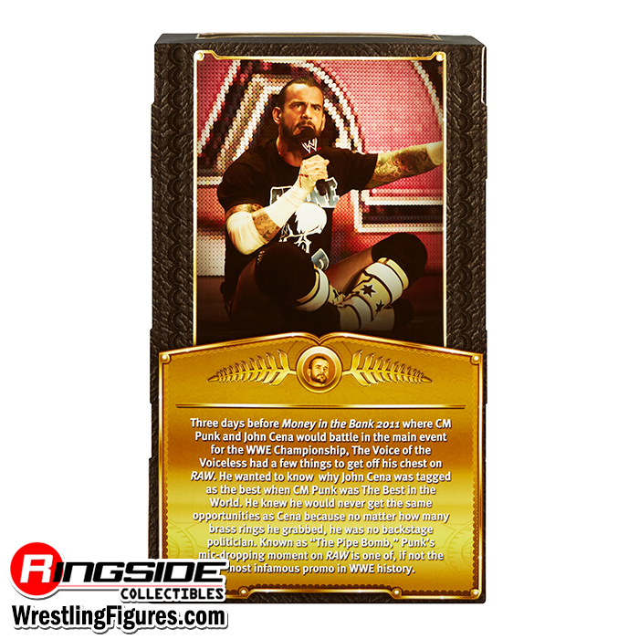 The Voice of the Voiceless speaks up with CM Punk in Mattel WWE Defining Moments, exclusive to Ringside Collectibles! The Defining Moments line celebrates the greatest moments in WWE history, and Punk shakes up the entire industry during his legendary “Pipe Bomb” promo. He’s ready to speak truth with a piercing headscan. Punk comes wearing yellow trunks with a black star design as well as yellow-and-white kickpad boots with a matching star design. He has accurate tattoos and his famous X-marked hand tape. His accessories include a black fabric “Stone Cold” shirt, black Nexus “N” armband, two additional sets of hands, and of course a microphone to deliver a searing speech. Pose Punk in a cross-legged sitting style for perfect screen accuracy!
