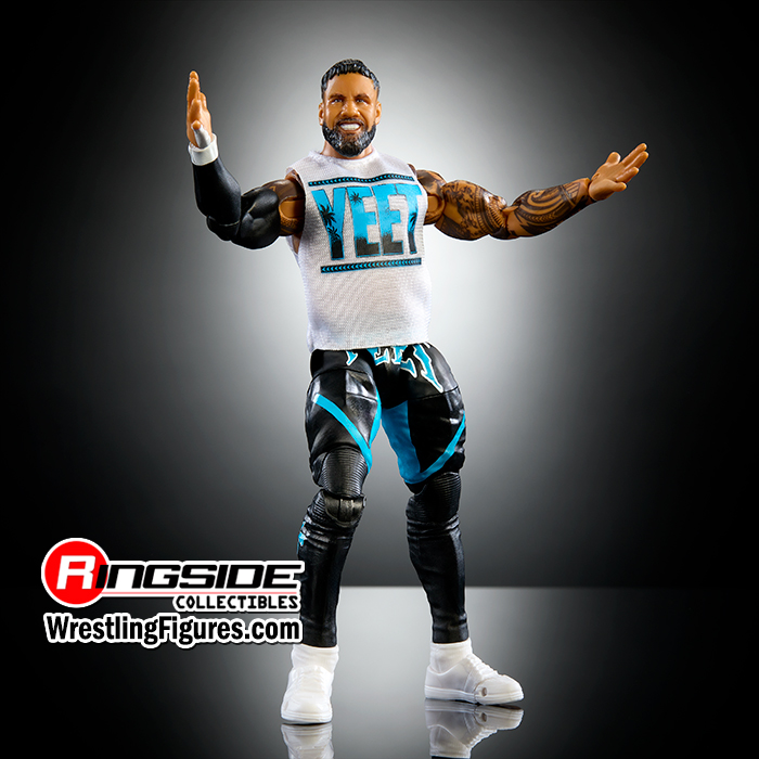 Eat, sleep, yeet, repeat: Jey Uso’s ready to forge his own path in Mattel WWE Elite Series 114! Main Event Jey reaches new heights with a determined, bearded headscan. He comes wearing black tights with vivid blue “Yeet” logo and blue trim, as well as white hi-top sneakers and black “Yeet” logo sleeve. Uso’s high-energy look is complete with accurate tattoos, white sleeveless “Yeet” logo tee, and an additional pair of hands for dynamic entrance poses!